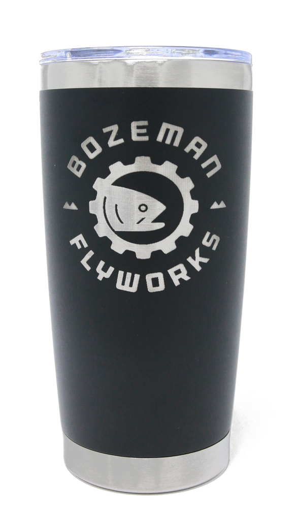 Whether you're sipping hot coffee before a chilly dawn launch or keeping your river soda ice-cold after a long float, the Bozeman FlyWorks Tumbler is built to fish as hard as you do. This 20oz insulated tumbler features a durable black powder coat, clear plastic lid, and our laser-engraved logo to let everyone at the boat ramp know where your loyalty lies. Keeps hot drinks hot and cold drinks cold longer than your buddy’s excuses for missing hooksets. Fits in most vehicle and drift boat cup holders. Built for the shop, the oars, or the tying bench.