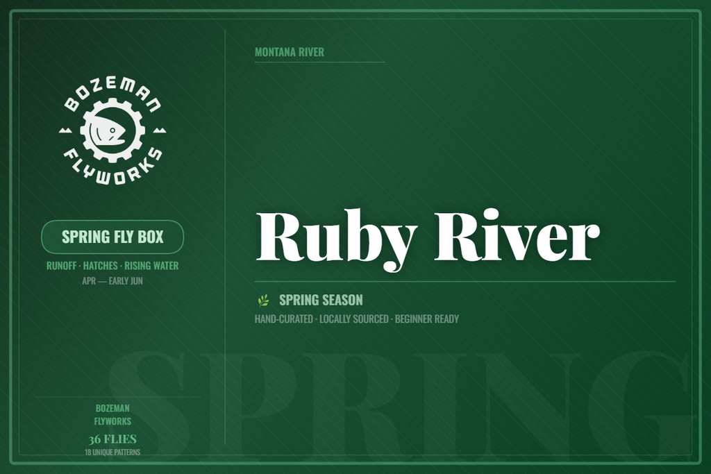 The Ruby River Spring Fly Box is hand-curated specifically for the conditions, hatches, and trout behavior you'll encounter on the Ruby from April through early June. Spring on the Ruby means rising flows and waking fish. Water is cold through May but nymphing produces well, and the lack of crowds means you often have long stretches entirely to yourself.